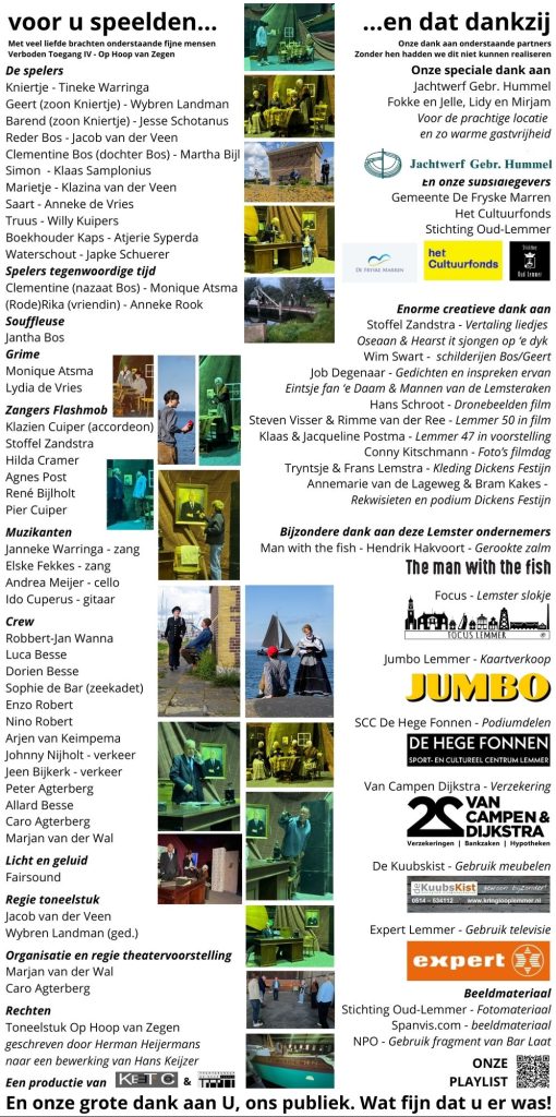 De Scheepswerf van de Gebroeders Hummel in Lemmer werd omgebouwd tot een heus theater. Tijdens twee avonden en één middag voorstelling genoten een kleine 400 mensen van “Op hoop van Zegen” .